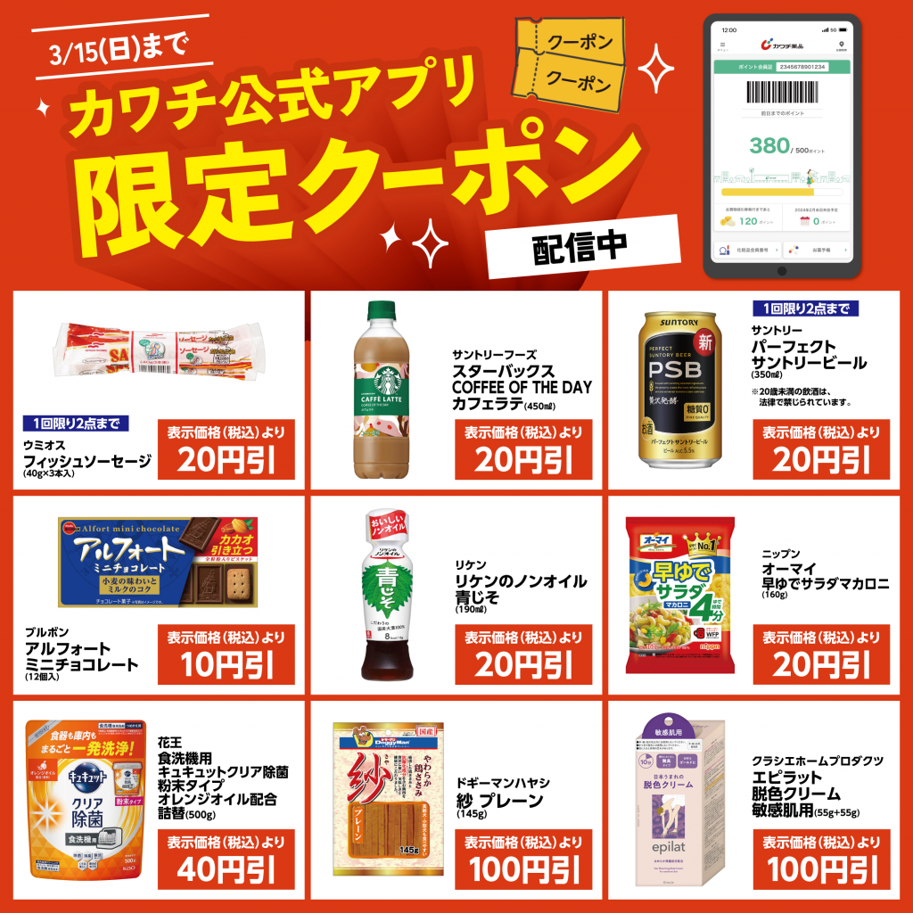 ※クーポンをご利用いただくには、カワチ公式アプリのインストールをお願いいたします。