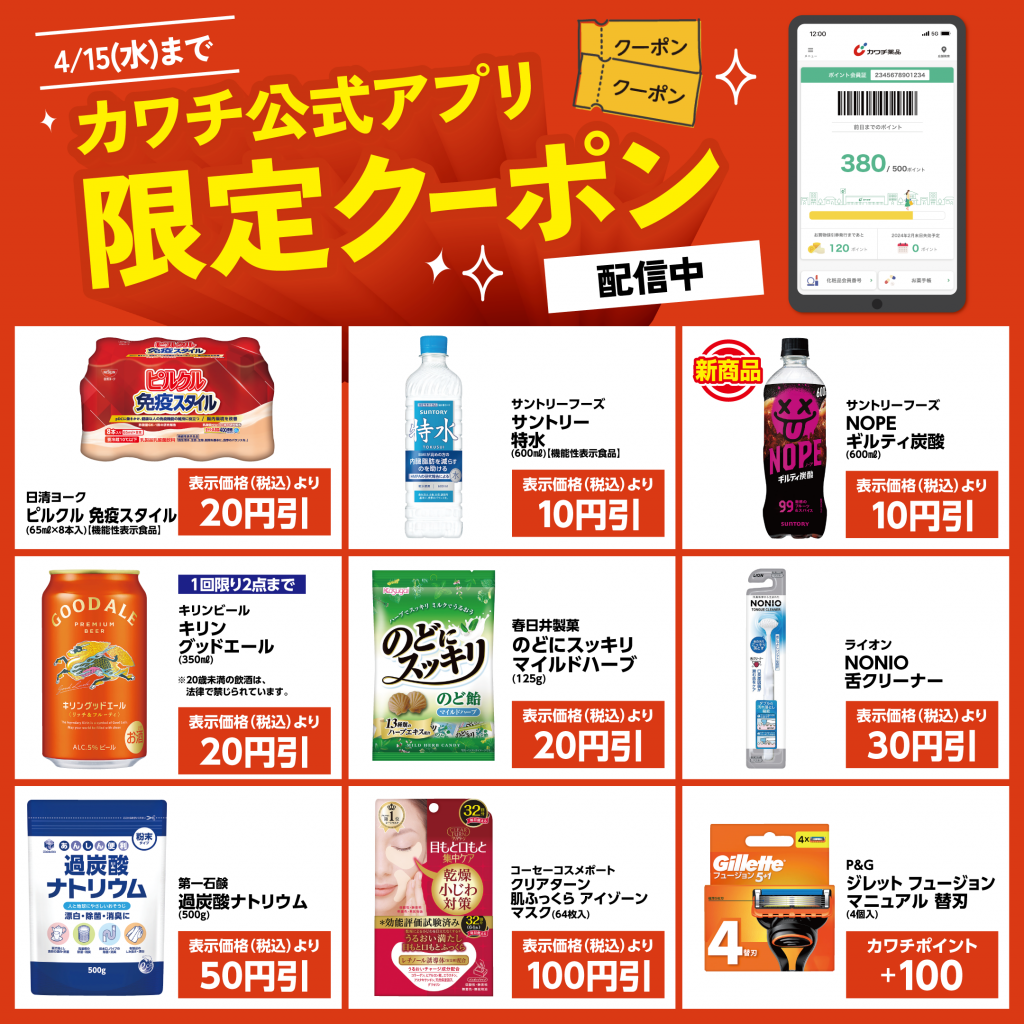 ※クーポンをご利用いただくには、カワチ公式アプリのインストールをお願いいたします。