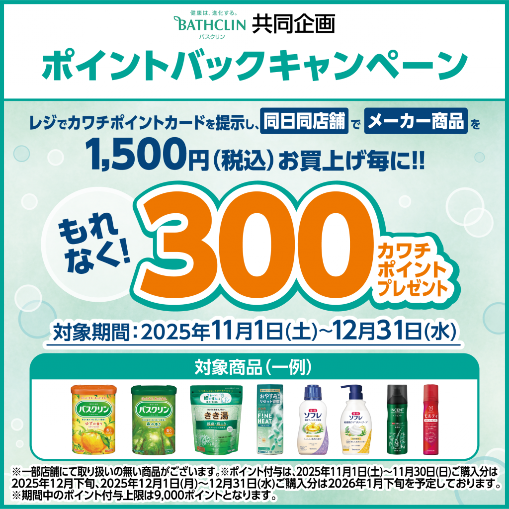 レジでカワチポイントカードを提示し、同日同店舗で対象商品を1,500円(税込)お買上げ毎に、300カワチポイントプレゼント!!