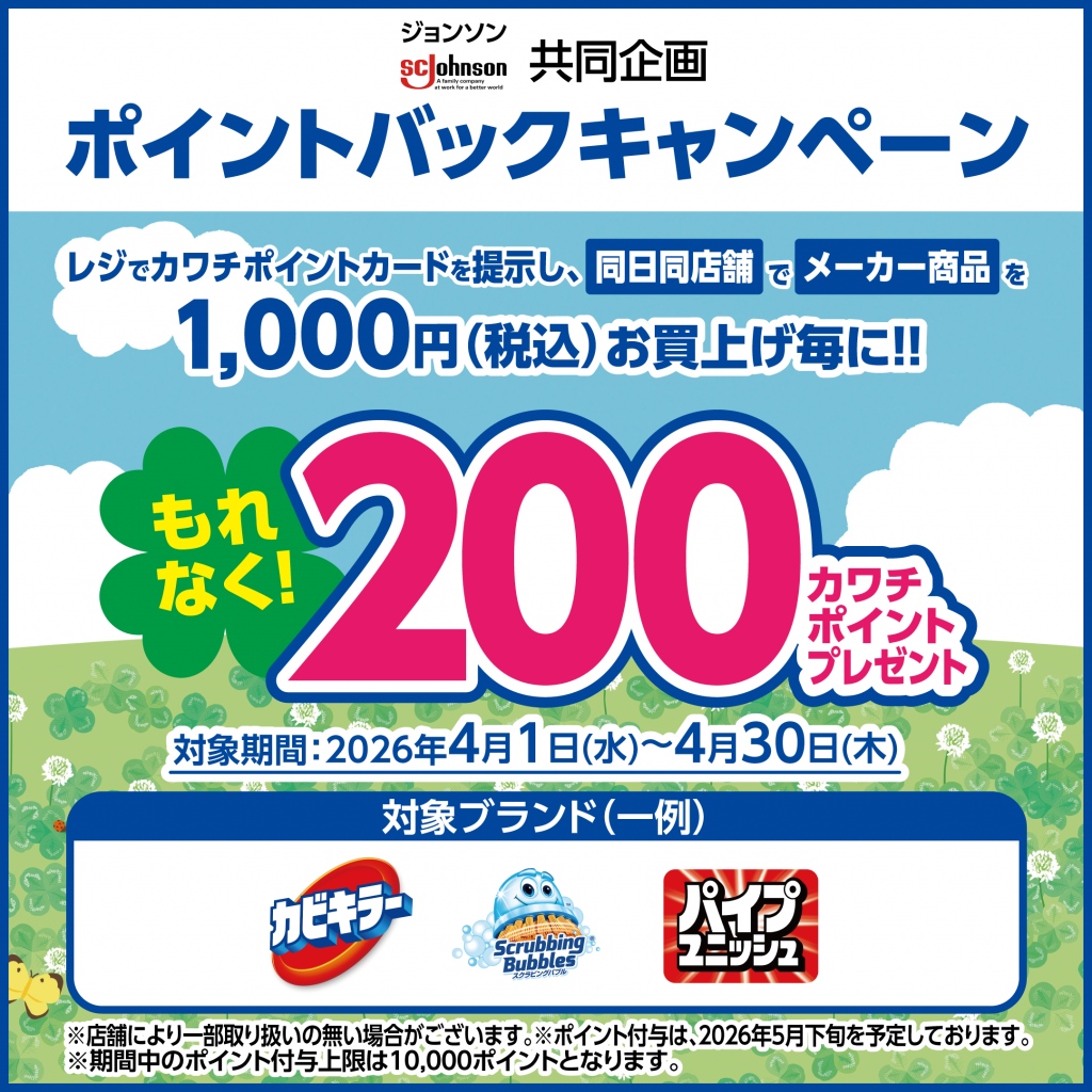 レジでカワチポイントカードを提示し、同日同店舗で対象商品を1,000円(税込)お買上げ毎に、200カワチポイントプレゼント!!