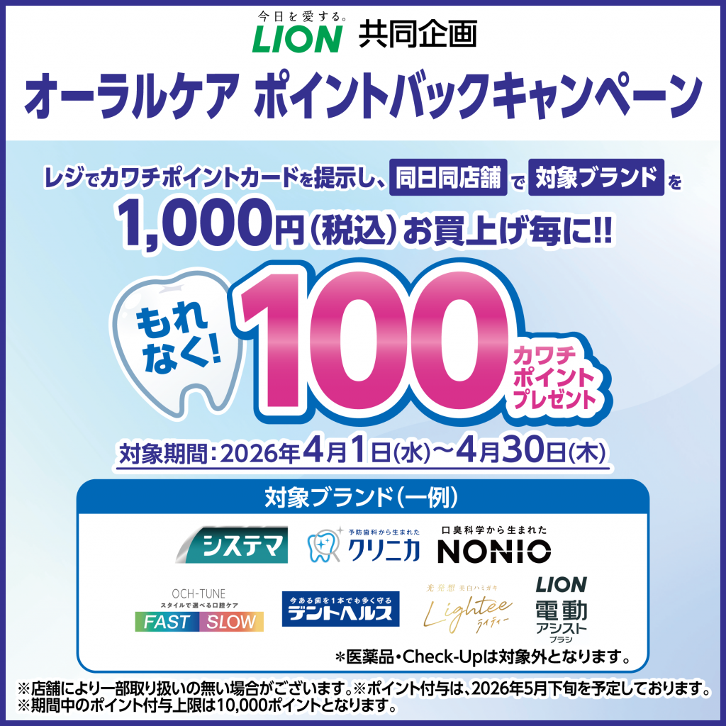レジでカワチポイントカードを提示し、同日同店舗で対象商品を1,000円(税込)お買上げ毎に、100カワチポイントプレゼント!!