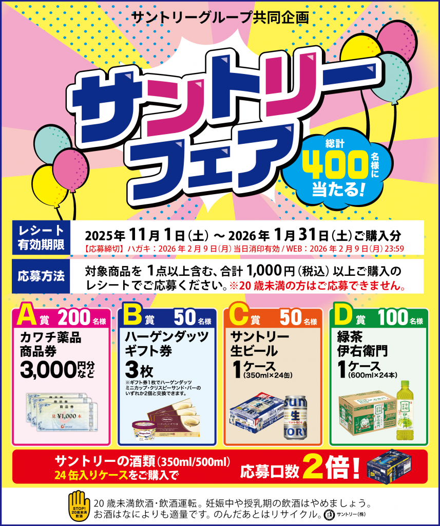 カワチ薬品にて、対象期間中にお買上げいただいた、対象商品1点以上を含む合計1,000円(税込)以上のレシート(複数枚合算可)を、WEBまたは応募ハガキにてご応募いただいたお客様の中から、抽選で総計400名様に商品券などの豪華賞品をプレゼント!