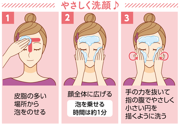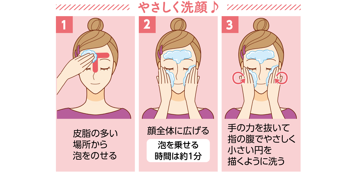 洗顔は古い角質や余分な皮脂、ホコリやクレンジング剤の残りを含めた汚れを落とすためのもの。皮脂の多い場所から顔全体に向けてお肌を擦らないようにたっぷりの泡やジェルを使ってくるくると小さい円を描くように洗いましょう。