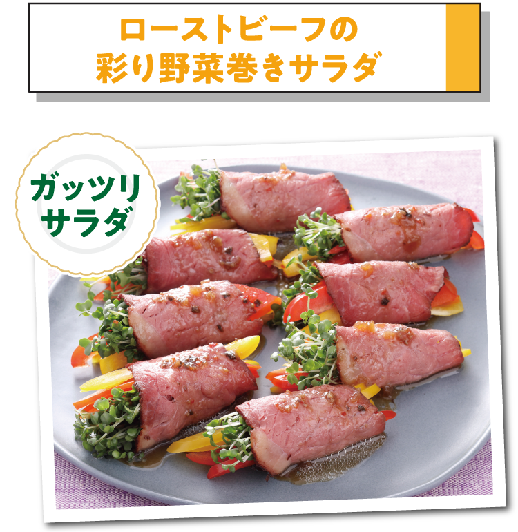 | (2) | ローストビーフに(1)を1/16量ずつ巻き、巻き終わりを下にして皿に載せる。 |