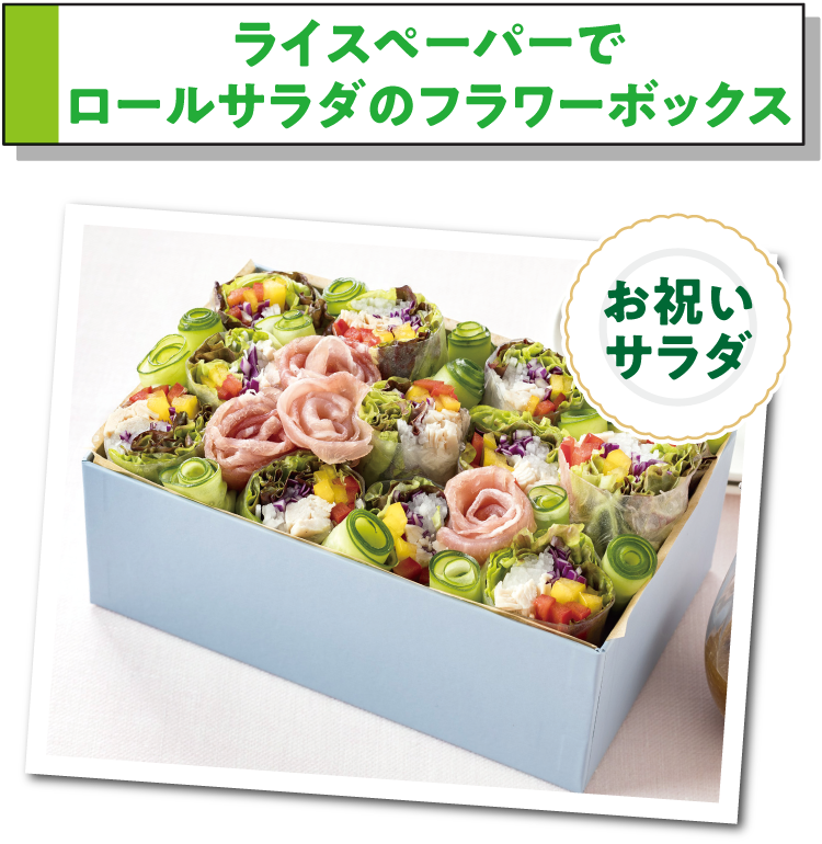| (2) | きゅうりはピーラーでリボン状に削り、端から巻く。生ハムは花形に4個巻く。 |