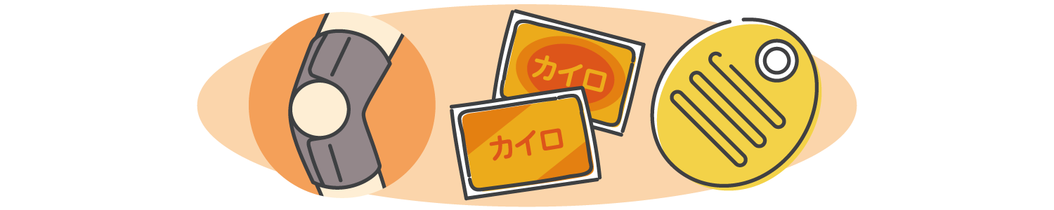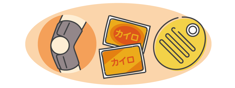 冷えや負担から膝関節を守りたい方は、関節を保護するタイプのサポーターがおすすめです。簡単に装着出来る筒型や締め付け具合を調整可能なベルト型など、様々な種類がありますので、使用する場面に合ったものを選ぶと良いでしょう。また、膝まわりや全身を温めることで血行が促進され、筋肉のこわばりを和らげる効果が期待できます。膝かけやレッグウォーマー、衣類の上から貼れる使い捨てカイロ、湯たんぽなどを活用して温めると良いでしょう。