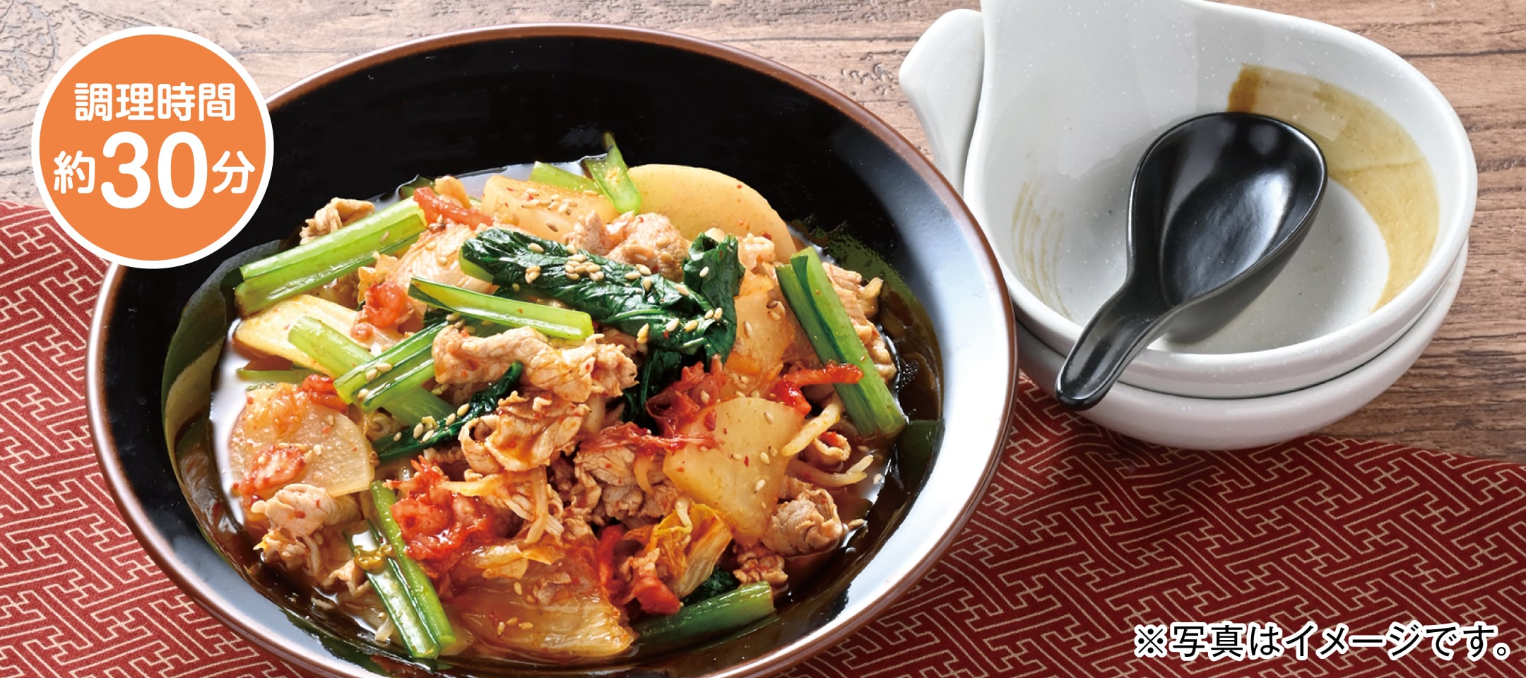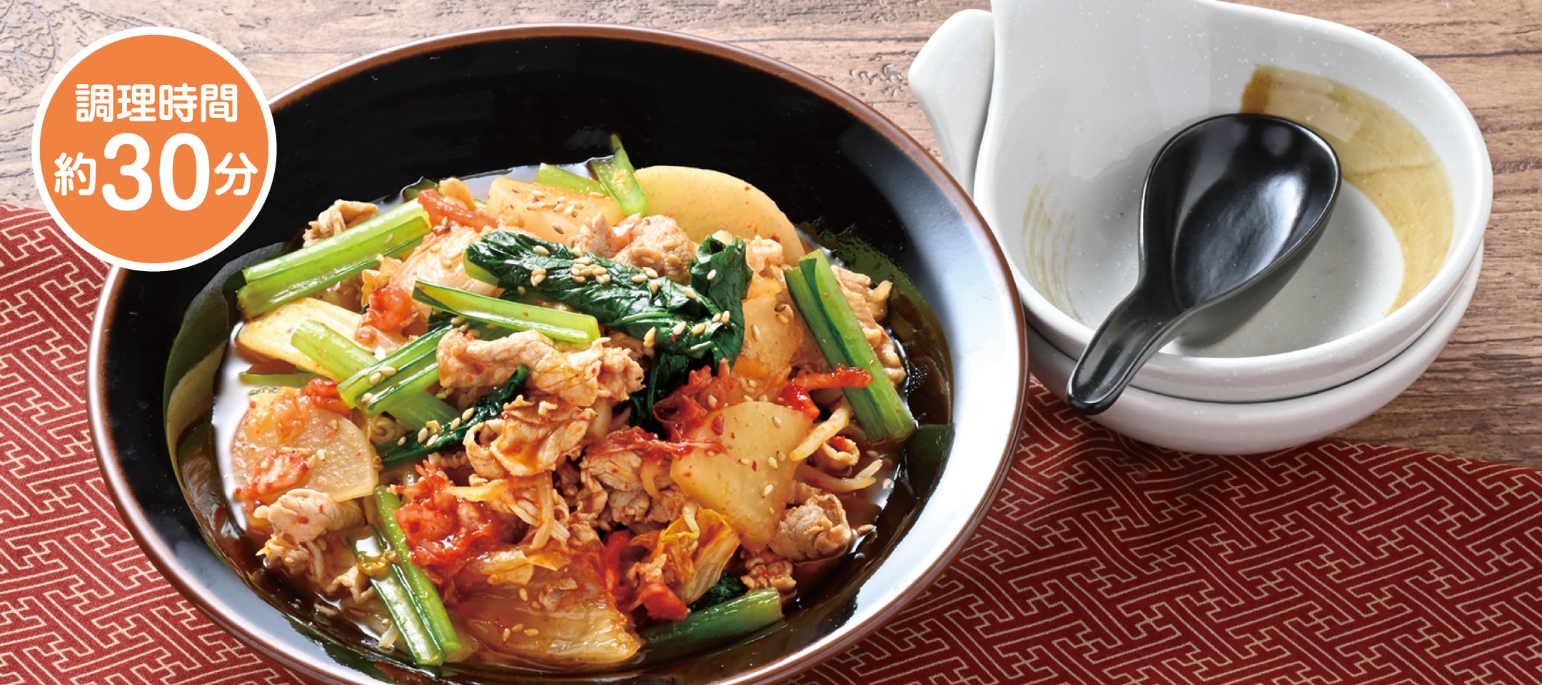 | (3) | フライパンにごま油とにんにくを入れて熱し、(1)を入れて中火で軽く炒めたら(2)の大根と白菜、もやし、白菜キムチを入れてさらに炒める。 | |