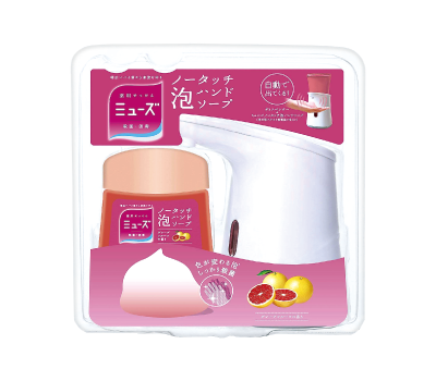 手をかざすだけで自動で泡が出る、薬用ハンドソープとディスペンサーのセット。