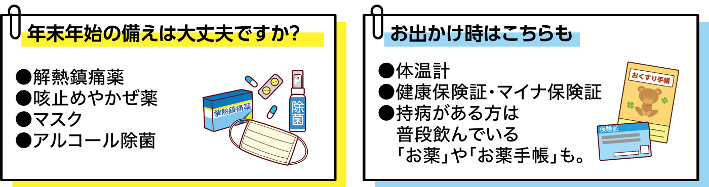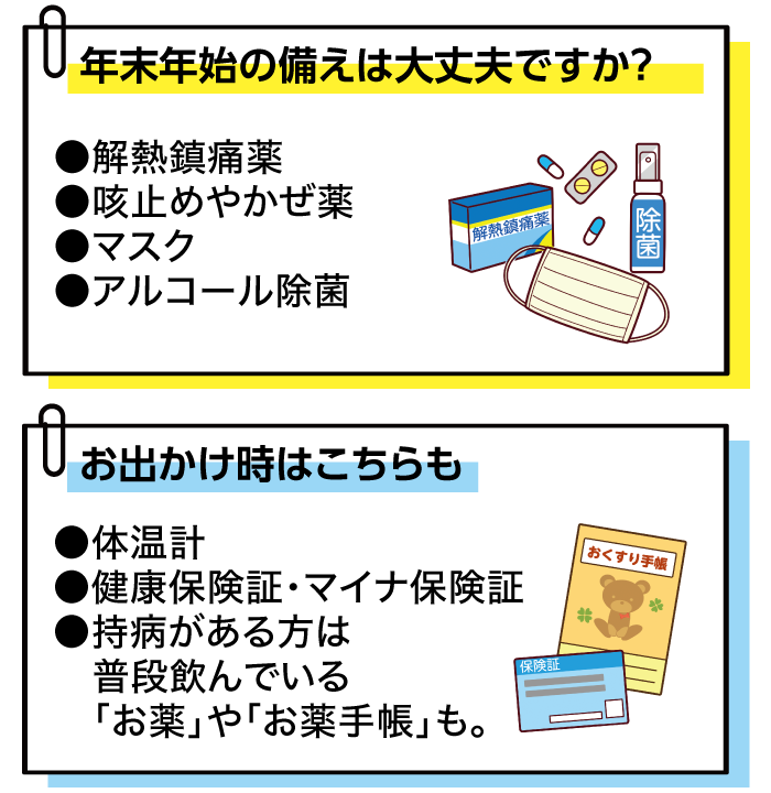 年末年始は多くの病院が休みになることが想定されるため、滞在先で診療してくれる病院を確認しておくことが大切です。また、すぐに受診できないという時に備えて、常備薬も持参しておくと安心です。
