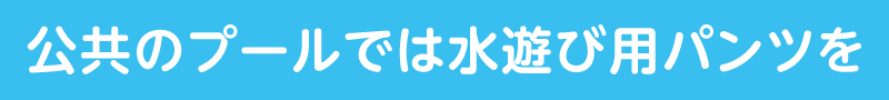 公共のプールでは、水遊び用パンツを着用しましょう。紙おむつは水を吸収して膨らみ、破れるとポリマーが流れ出すので避けましょう。