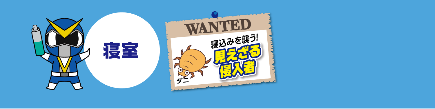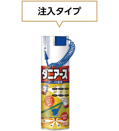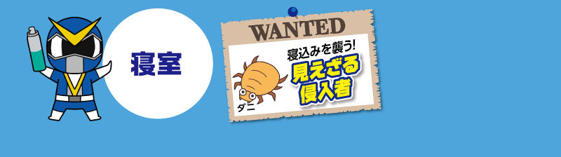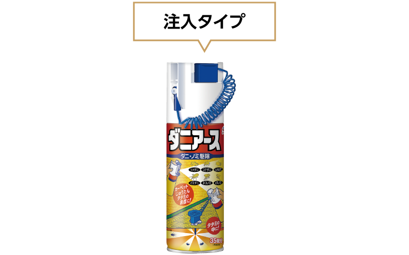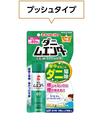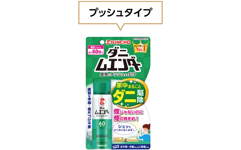 お部屋の広さに合わせた回数を空間にプッシュするだけで、寝具やソファーなどに潜むダニも家中まるごと駆除!