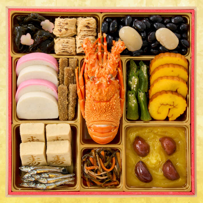 昆布旨煮(梅型百合根羊羹)、焼き湯葉巻、黒豆煮、白花豆煮、紅蒲鉾、白蒲鉾、たたきごぼう、ロブスター、オクラの浅漬、伊達巻、寿高野豆腐、田作り煮、きんとん、渋皮栗甘露煮、松前漬