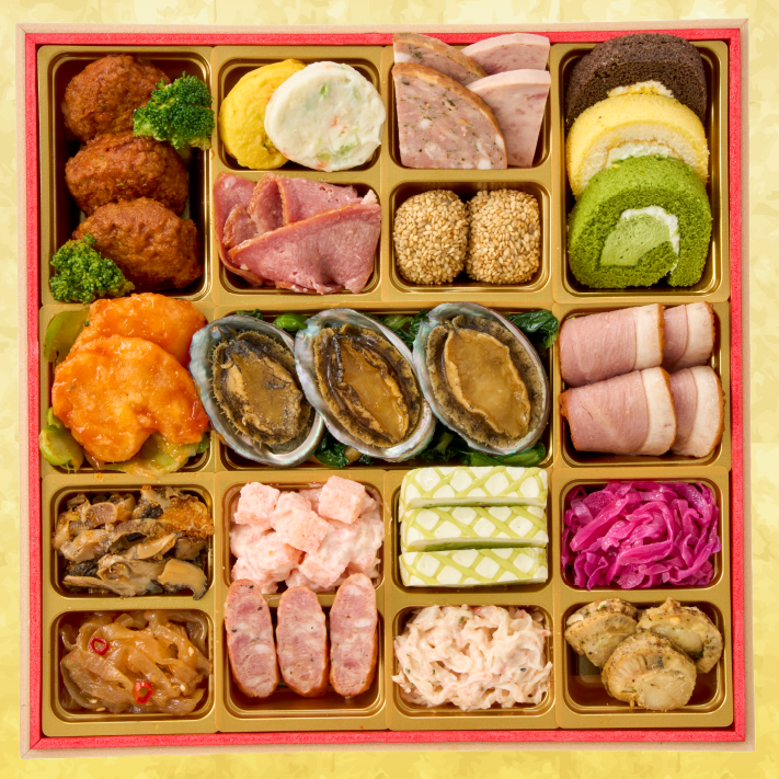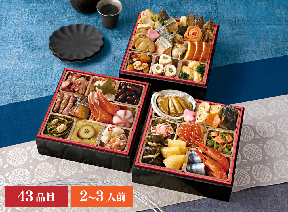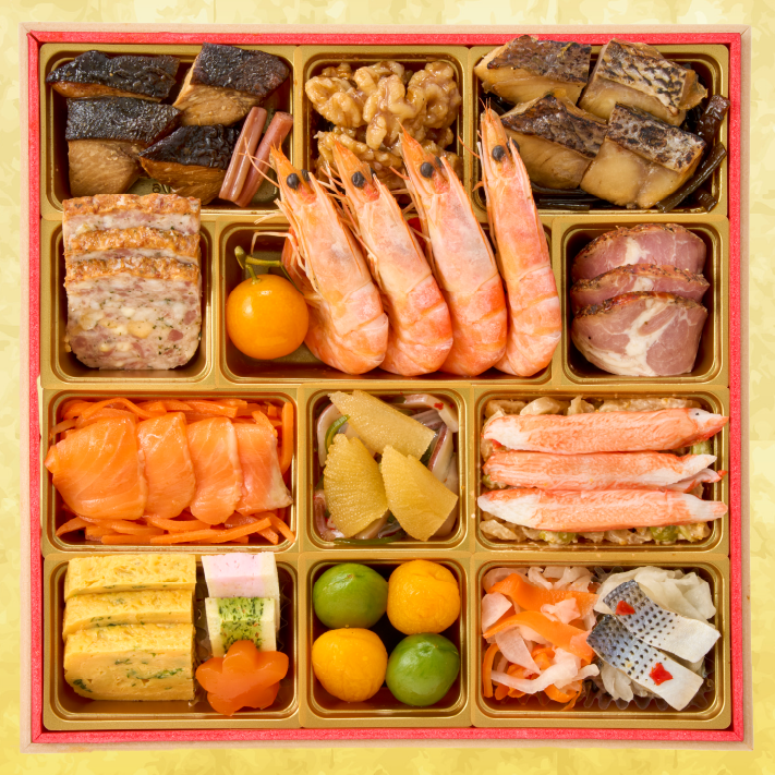 ぶり照焼、はすの芽(梅酢風味)、くるみ甘露煮、わかめ煮、真鯛幽庵焼、ミートローフ、葉付金柑甘露煮、有頭海老、ローストポーク、キャロットラペ、スモークサーモントラウト、ソデイカ昆布和え、数の子、大根焙煎胡麻サラダ、蟹風味蒲鉾土佐酢漬、九条葱入り玉子焼、博多高野(海老)、博多高野(ほうれん草)、梅型蒟蒻、若桃甘露煮、杏子煮、紅白なます、こはだレモン