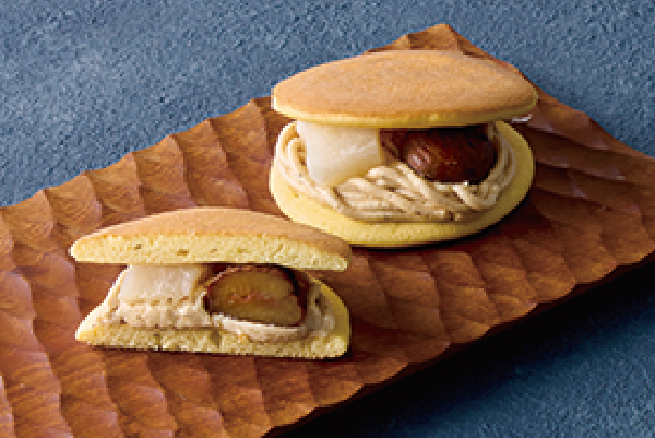 ふんわりとした風味豊かな生地に、モンブランあんと渋皮付き一粒栗・求肥餅を挟みこみました。