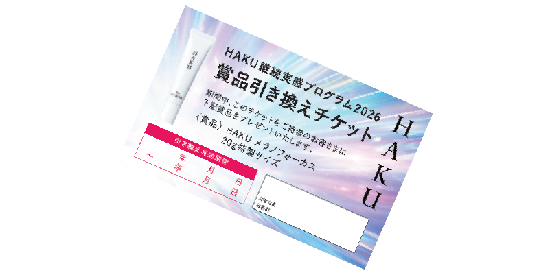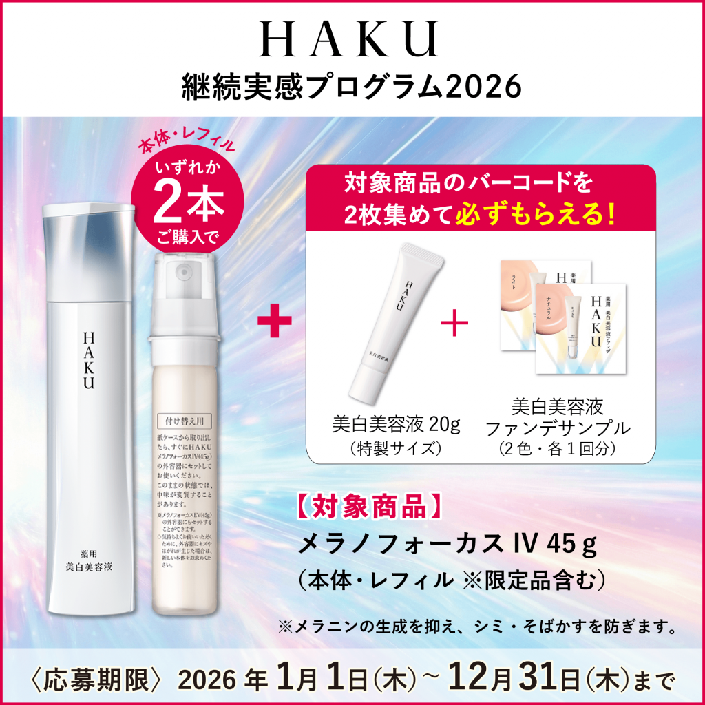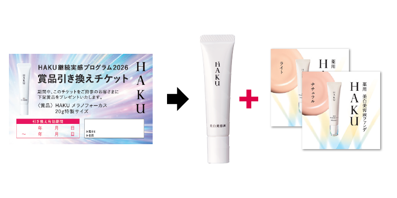 期間中、HAKUの対象商品をご購入いただくと「HAKUメラノフォーカス 20g特製サイズ + 美白美容液ファンデサンプル(2色/各1回分)」をもれなくプレゼント!
