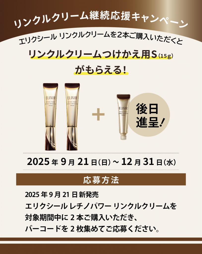 ※リニューアル前のレチノパワー リンクルクリーム、及びエリクシール ホワイト エンリッチド リンクルホワイトクリームはキャンペーン対象外です。